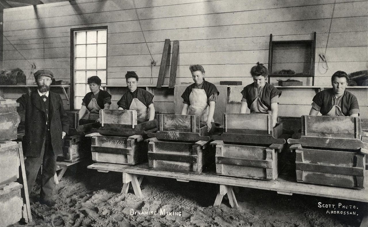 Na fotografii z roku 1897 je vidět skupina žen míchajících ručně dynamit, snímek byl pořízen přímo v Nobelově továrně v tehdejším malém městečku Ardeer (Skotsko).