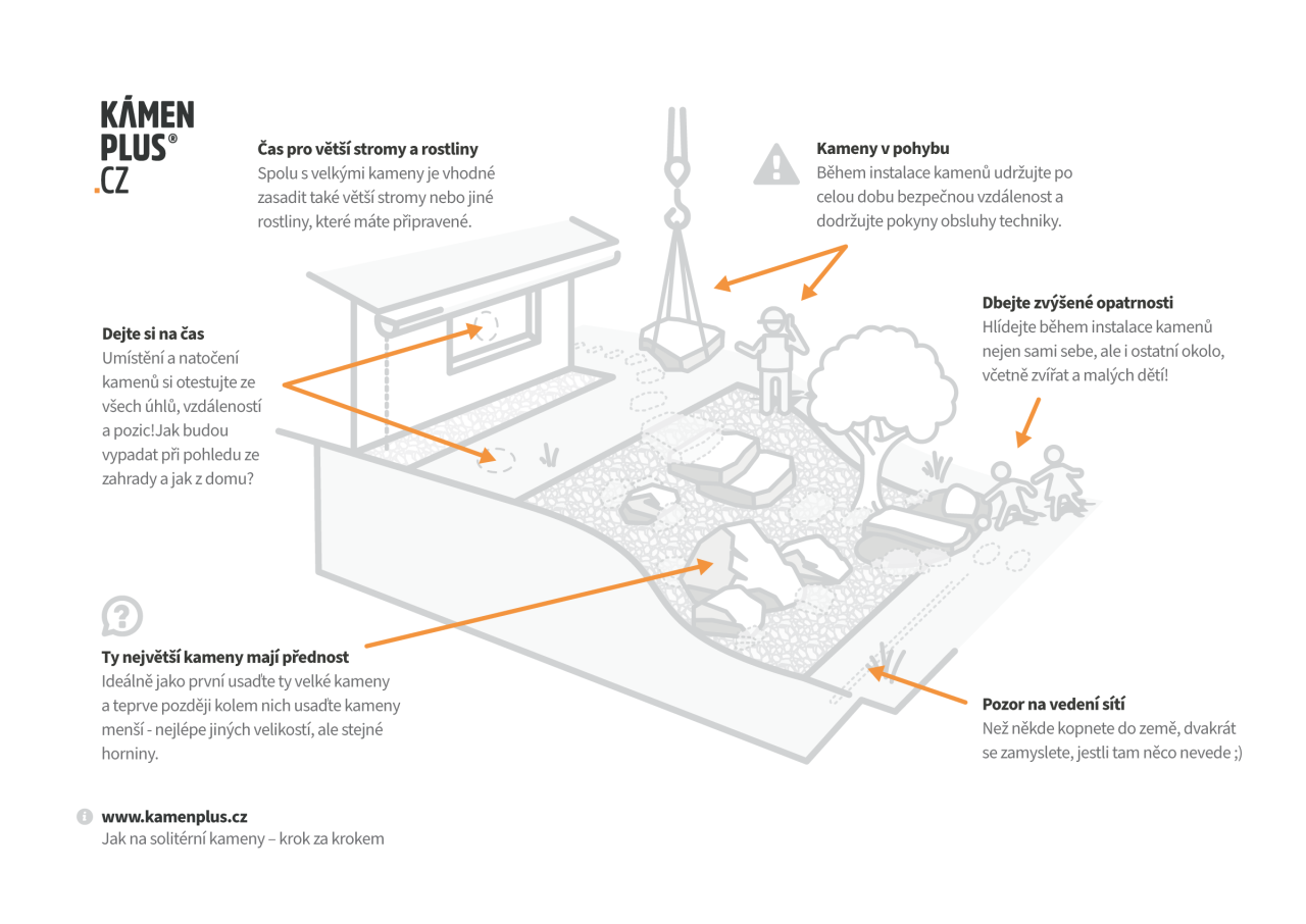 Pokud už máte vše promyšlené, můžete se pomalu pustit do přípravy místa, kde budete kameny usazovat. Protože je každý kámen jiný tvarově, váhově i svými fyzickými vlastnostmi, je potřeba tomu adekvátně přizpůsobit přípravu místa i volbu manipulační techniky. Zkusím vám sepsat opět jen několik nejdůležitějších kroků.
