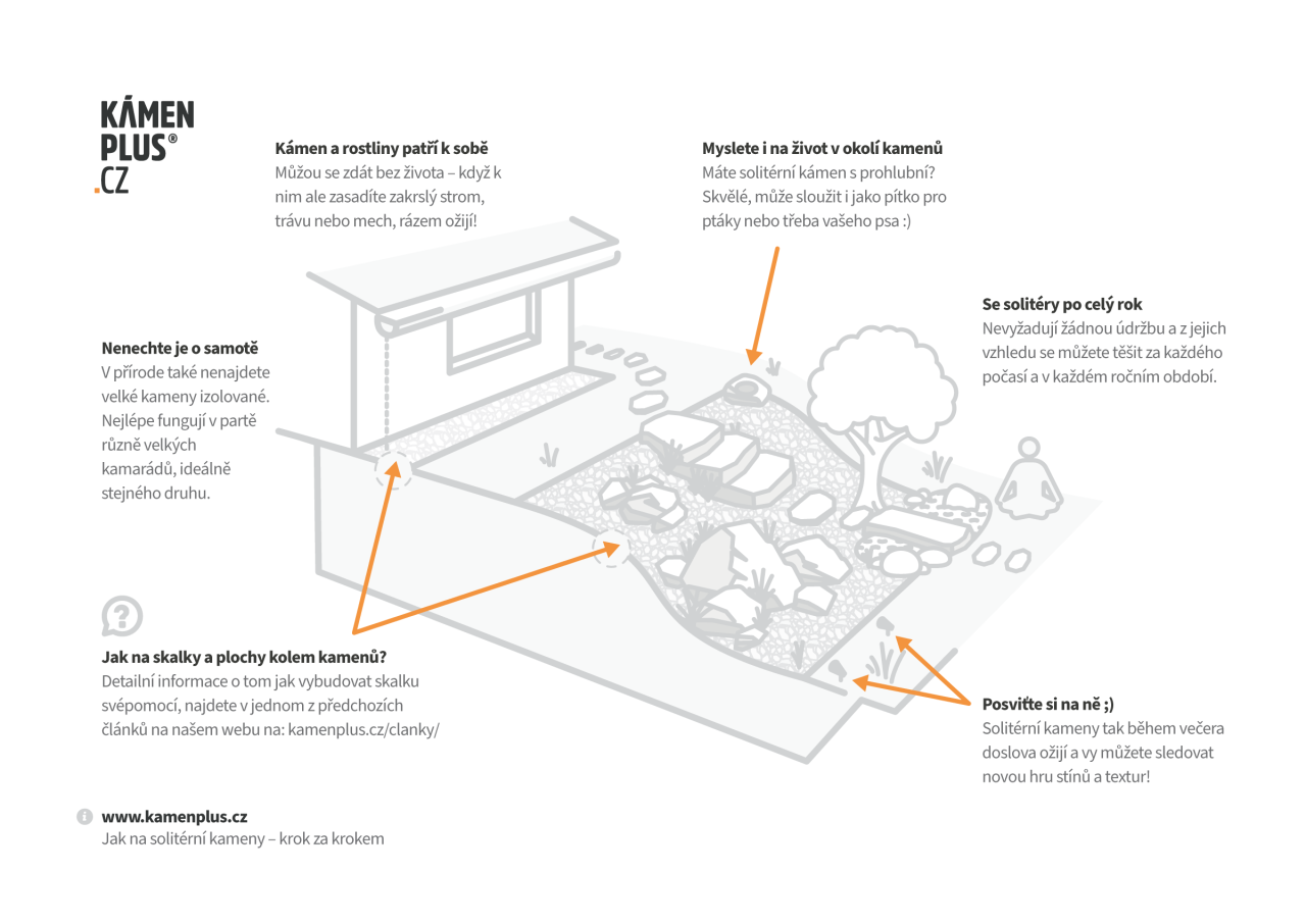 Na našem webu jste se už mohli dočíst, jak svépomocí na kamennou cestu, suchou kamennou zídku a nakonec měl vše zakončit článek o skalkách a bezúdržbových plochách. Ukázalo se ale, že naši zákazníci a čtenáři tady na webu jsou hladoví po dalších informacích, a proto vznikl tento článek věnovaný solitérním kamenům.