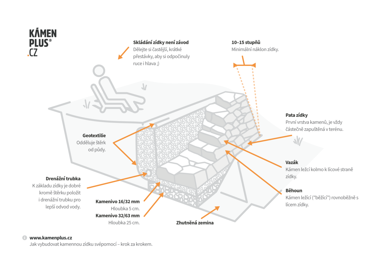 Postup výstavby suché zídky je nutné téměř vždy adekvátně přizpůsobit konkrétním podmínkám. Pokud si nebudete něčím jisti, přijeďte se podívat k nám na prodejnu a rádi vám osobně poradíme 😉