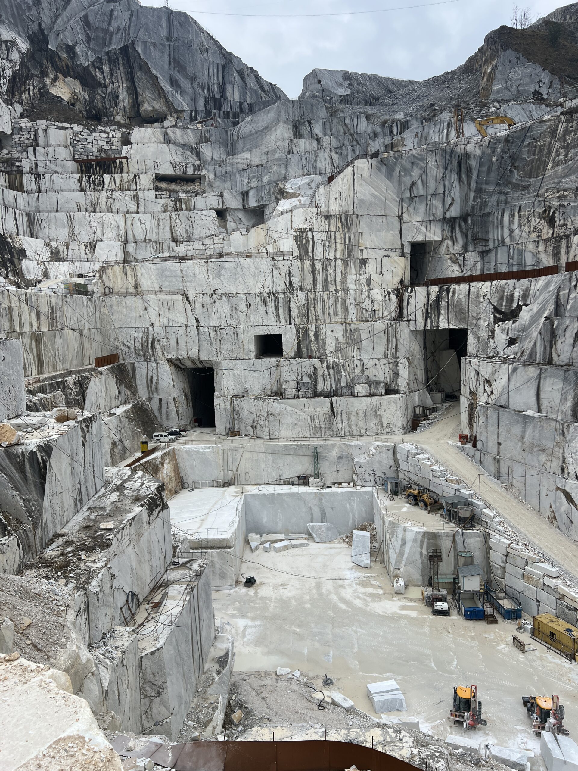 Po půlhodině cesty jsme na místě. Před námi se otevírá pohled na obří lom, kde se těží legendární carrarský mramor. „Ročně se tady vytěží až 200 000 bloků,“ říká Pamela a ukazuje na mohutné pilíře lanových pil, které vyřezávají mramor přímo ze skály. Kolem nás se pohybují bagry a nakladače.