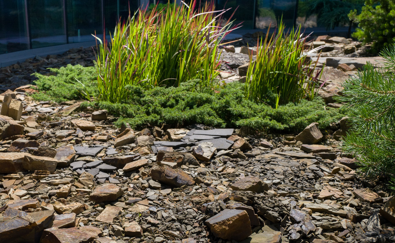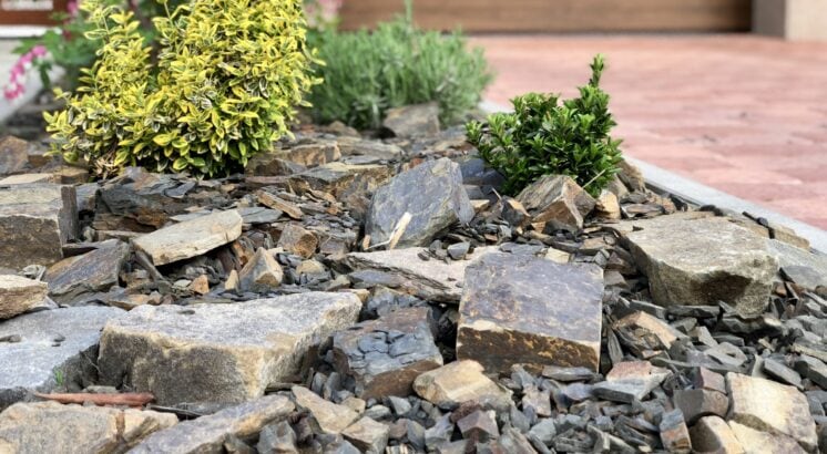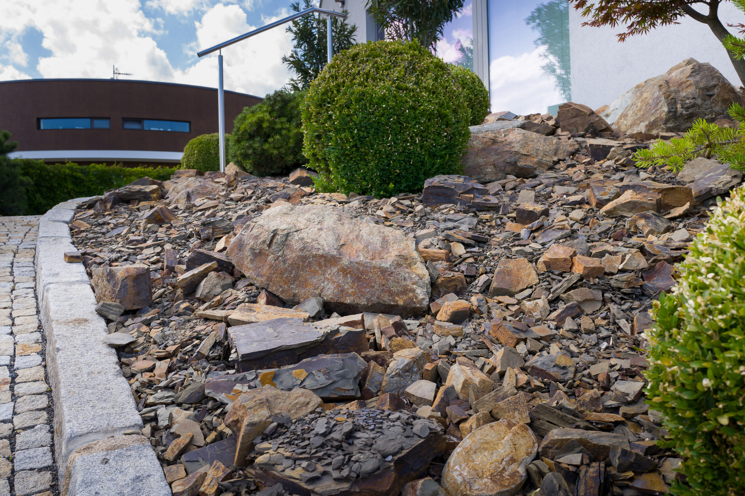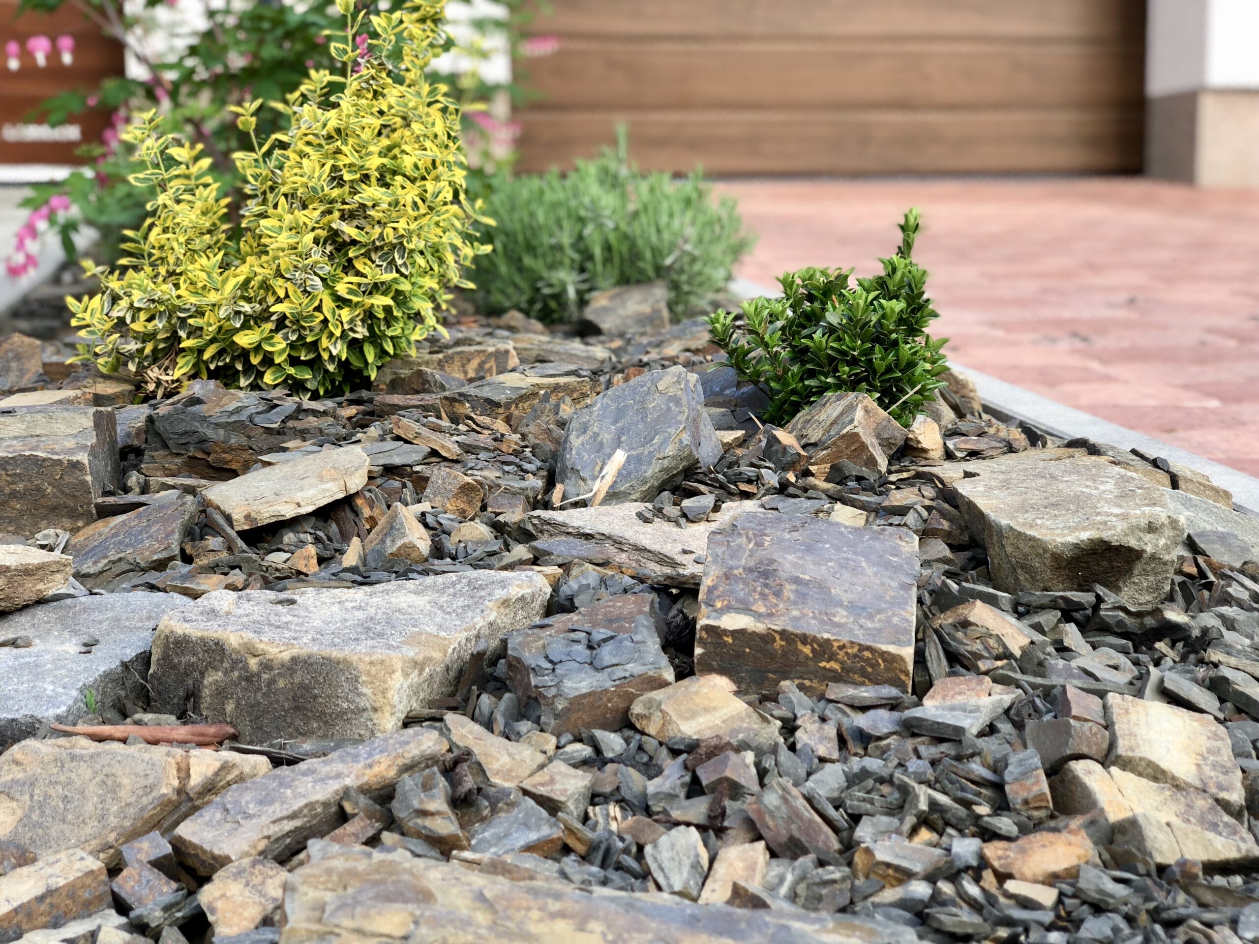Skalky a bezúdržbové plochy větších rozměrů, jako kamenná mulčovací kůra, atp.