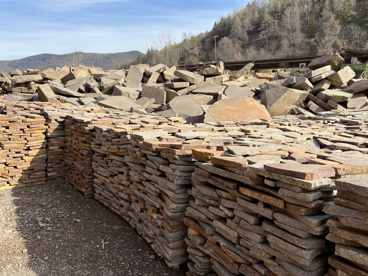 Italský porfyr přímo v kamenolomu, už vytříděný na paletách. Každý kus je krásně rovný, jeden jako druhý.